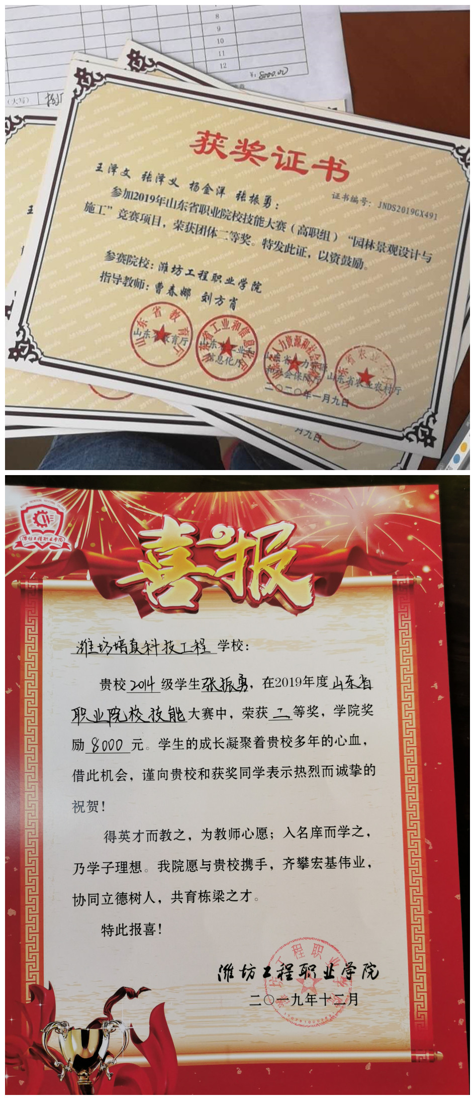 在校期间,张振勇勤奋好学,动手能力强,每年都获得学校奖学金,被评为“优秀毕业生”。2017年高职单招考试中,他以优异成绩被潍坊工程职业学院园艺技术专业录取。通过学习园艺技术,掌握了果树、蔬菜、花卉栽培管理、苗木繁育、设施栽培、病虫害防治、果蔬贮藏加工以及产品营销和企业管理的能力。2018年7月学院推荐张振勇到“尚庄园林”参加了为期一个月的顶岗实习。2018年9月,他在世界技能大赛园艺项目(昌邑)国际邀请赛中,被授予“优秀志愿者”称号。2019年5月,在全国职业技能大赛园林景观设计与施工大赛当中荣获团体二等奖。2019年9月,在一带一路世界技能大赛园艺项目国际邀请赛荣获综合表现金奖。2019年11月,在山东省职业技能大赛园林景观设计与施工大赛荣获团体二等奖。
