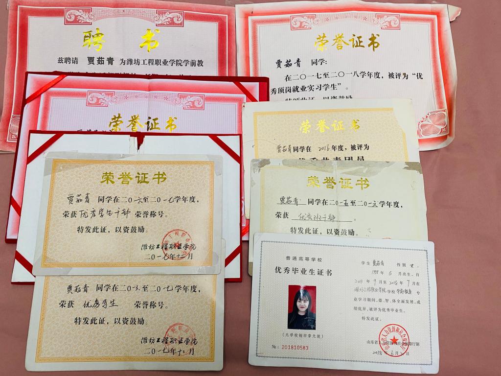 在校期间,她学习成绩优异,乐于助人,任学前教育专业一班班长、五年一贯制学前教育专业学生会负责人。她积极配合班主任老师工作,带头参加学校组织的各项活动,凭借自身努力,先后被评为“优秀学生”,“优秀班干部”“优秀学生会干部”“山东省优秀毕业生”等荣誉称号。