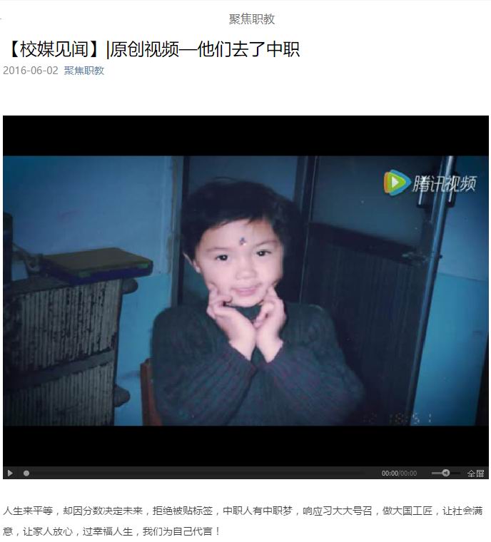 《他们去了中职》是我校学生在老师的带领下制作的原创视频。视频在创意和制作过程中得到了校领导的大力支持、全体教职员工大力配合、帮助和在校生的热心参与。学生在视频制作过程中寓教于做,边学边做,在做中学,得到了社会的广泛认可。
