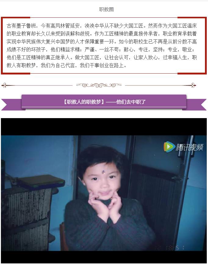 5月26日,我校原创视频《他们去了中职》在校微信公众平台悄然上线,引起一致好评。随后,该视频先后被“中国职业教育”“聚焦指教”“职教圈”“青州生活帮”“青州新闻网”等多家微信公众平台转载,影响广泛而强烈。