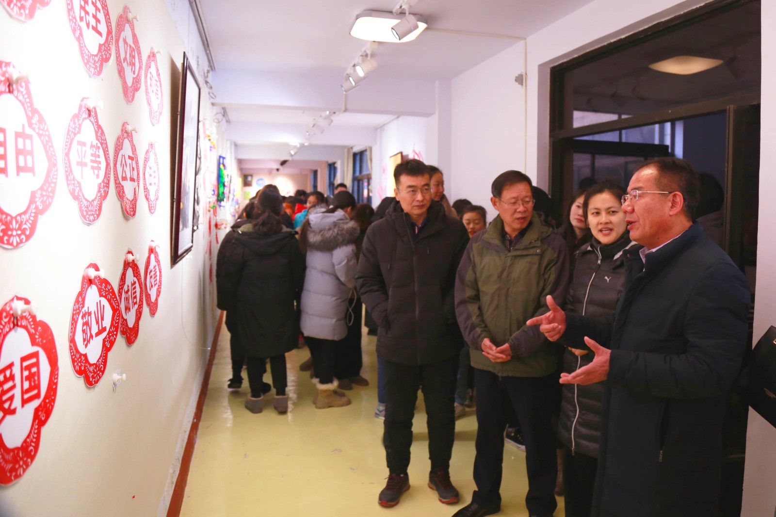 近日,学校第四届师生艺术作品展在北校区教学楼艺术长廊开展。学校校长王兆才、党支部书记李爱国、副校长孙义欣与师生们一起观展。