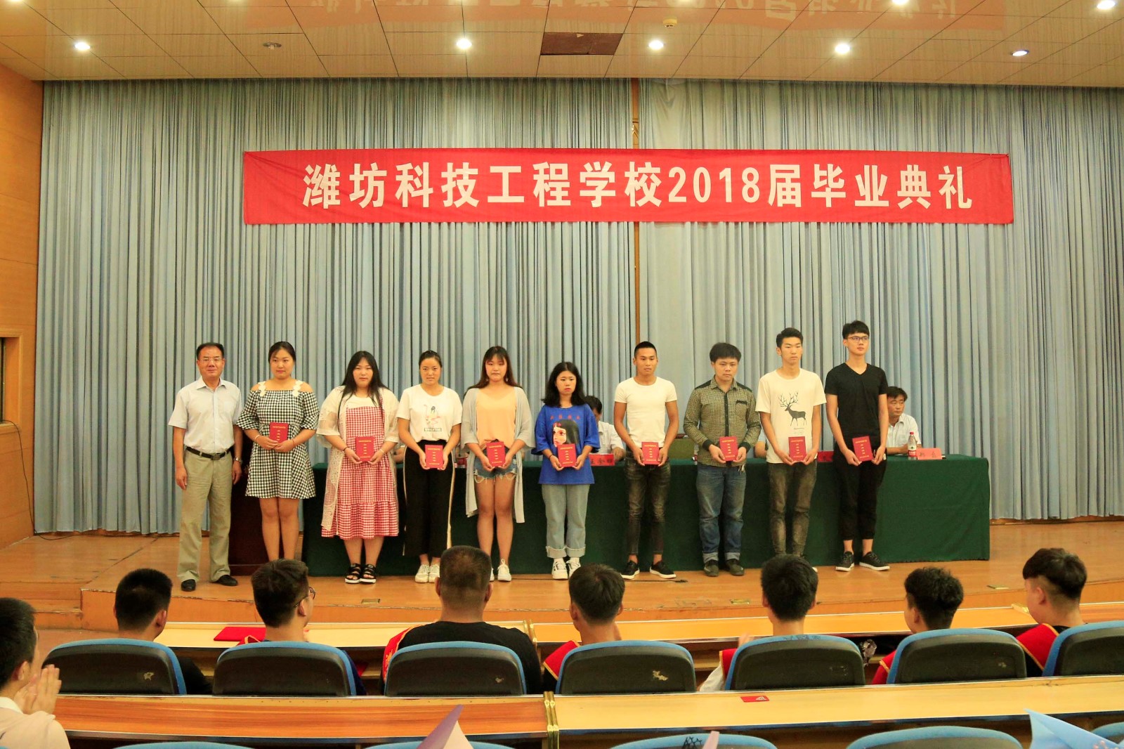 7月11日上午,我校2018届毕业典礼在学术报告厅举行,潍坊工程职业学院副院长王金明出席典礼并为优秀毕业生代表颁发荣誉证书。我校校长王兆才、党支部书记李爱国、副校长陈文秀、副校长孙义欣、团委学生科科长郑磊、部分教职工及2018届毕业生代表参加典礼。