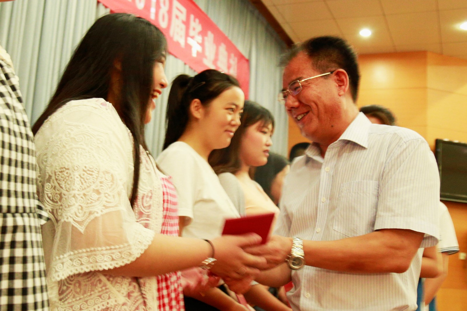 校长王兆才为毕业生代表颁发毕业证书并致辞。他首先向王金明副院长的到来表示欢迎,向全体毕业生表示祝贺和祝福,向帮助学生成长的家长、亲朋和老师表示感谢。随后,他对全体毕业生提出三点希望:一是在平凡中创造非凡。他以今年全国人大代表、95后砌砖工邹彬为例,号召毕业生以劳动者的身份为荣,爱岗敬业、一丝不苟、精益求精,成就出彩人生。二是在坚持中实现梦想。他引用美国著名主持人奥普拉的话说明梦想的重要性,期望毕业生坚守梦想,不放弃、不抛弃,脚踏实地,埋头苦干,让梦想成真。三是在奋斗中追求幸福。他引用习近平总书记在2018新年贺词中所说的“幸福都是奋斗出来的”一句,要求毕业生立足本职、积极奋斗,用勤劳双手编织美丽人生,用热血青春开创人生精彩,用辛勤汗水浇灌幸福之花。