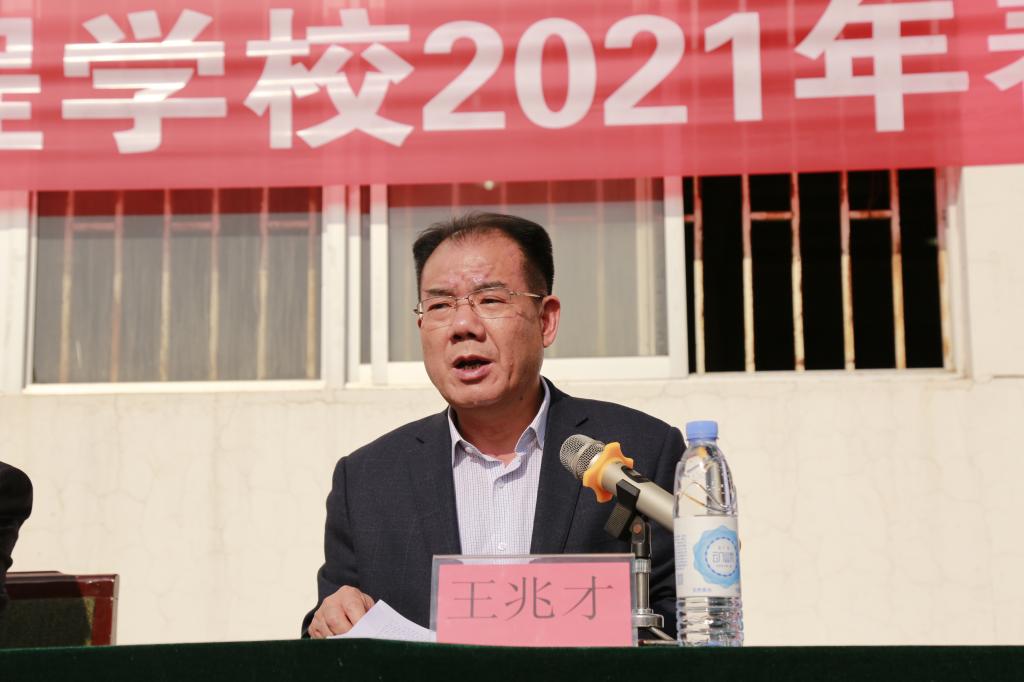 王兆才在致词中指出,近年来学校高度重视体育工作,贯彻落实两办《关于全面加强和改进新时代学校体育工作的意见》,不断深化体育教学改革,持续改善体育教学条件,定期举办校内运动会,积极参加青州市中学生体育竞赛活动,取得了明显的育人成效。希望大家以本次运动会为契机,进一步树立健康第一的教育理念,推动学生文化学习和体育锻炼协调发展,以“天天锻炼、健康成长、终身受益”为目标,大力开展“走下网络、走出宿舍、走向操场”课外体育锻炼活动,不断提升师生身体素质和健康水平,以此推动学校各项事业发展。