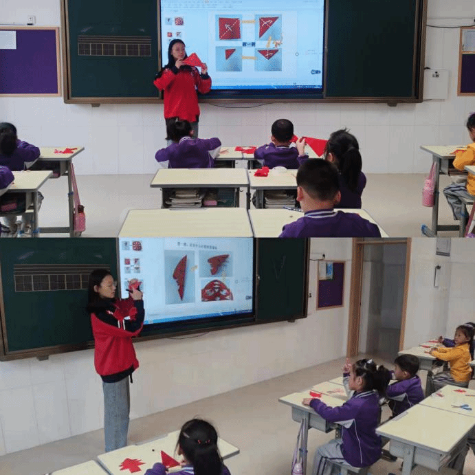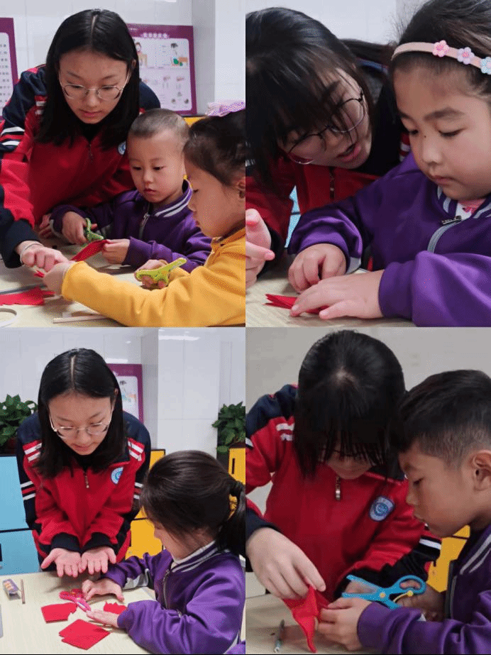 在活动中,学前教育的学生为这里的一年级学生讲解了剪纸的制作步骤及安全事项,带领他们掌握“折、画、剪”基本的剪纸技巧,感受剪纸这项民间传统文化的艺术魅力。