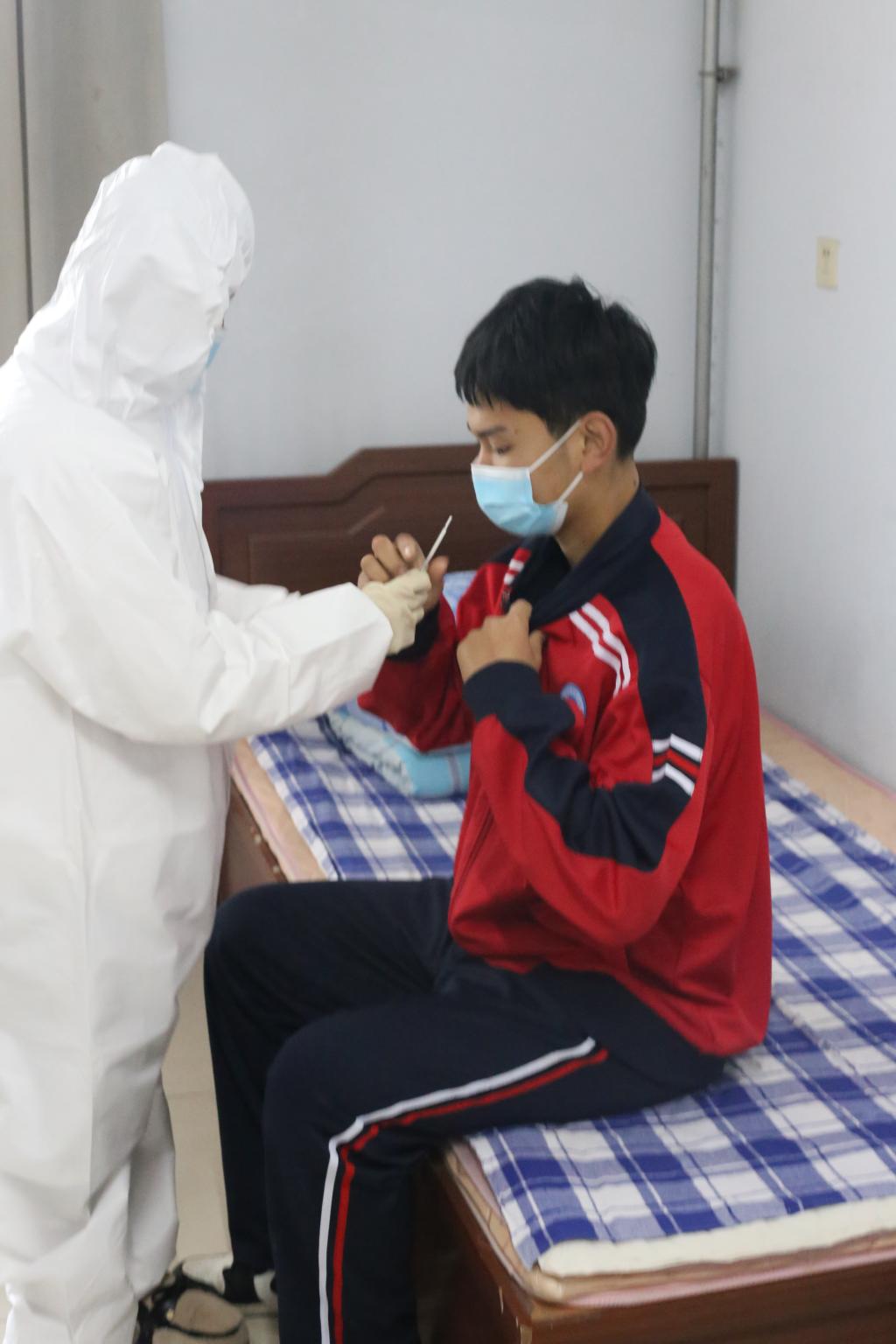 测得一位学生体温超过37.3℃并发出警告,值班领导迅速让测温区内的全部同学停止前行,校医把学生带离现场用水银体温计二次进行检测,体温仍异常的情况,及时上报学校。迅速将该生送至学校隔离室,进行隔离。