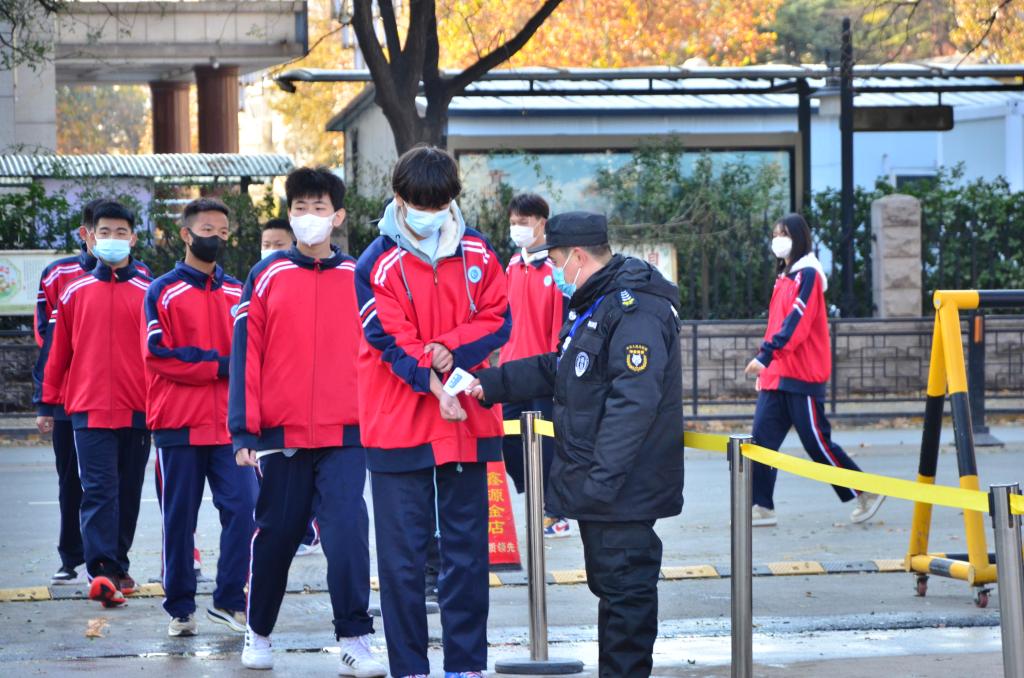 校门口教师组织学生有序排队,佩戴口罩,间隔一米,依次测温登记后按规定路线进入校园。强调学生入校做到“三严”,即:严 “测温”、严“保距”、严“防护”。