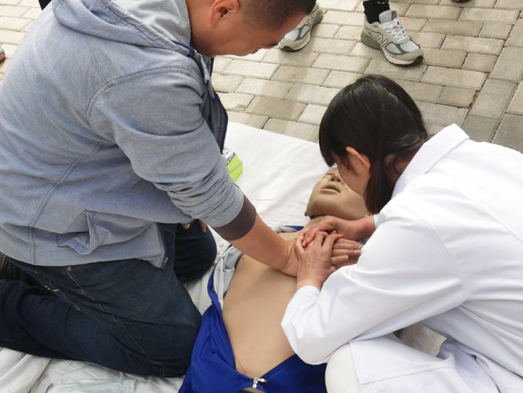 培训中,校医列举了常见的突发安全事故,指出了掌握紧急急救技能的必要性和重要性;强调心源性猝死可能随时、随地、随人发生。随后,校医使用人体模型讲解示范了突发情况下的急救方法和技巧,介绍了自动体外除颤仪(AED)及其使用方法。