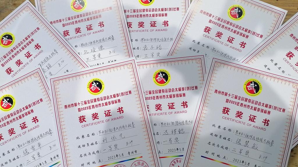 28日,学校参加青州市教育与体育局等8部门联合主办的第十三届全民健身运动会太极拳(剑)比赛暨2023年太极拳锦标赛,获团体二等奖和个人项目一等奖2项、二等奖2项、三等奖5项。