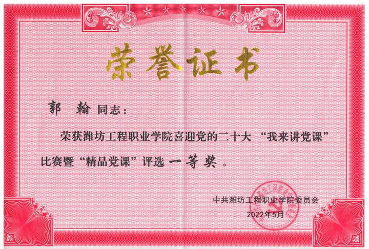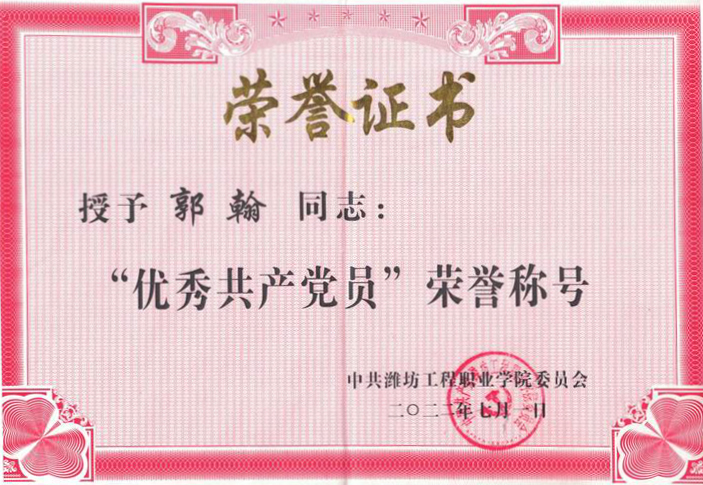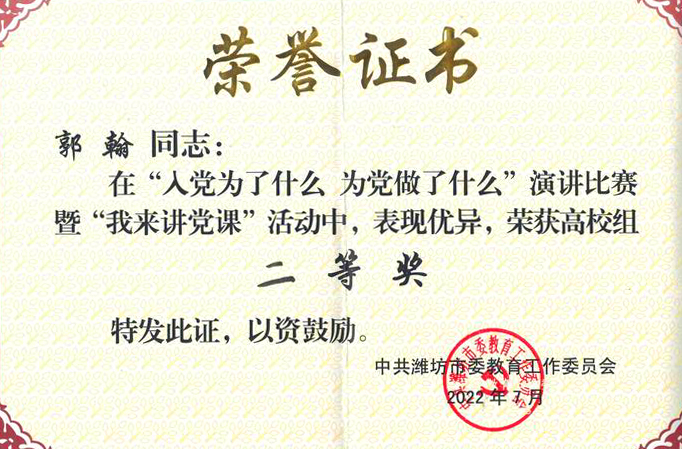 郭翰同志以优秀党员的标准要求自己,发挥党员先锋模范作用,用行动诠释共产党员的先进性。在潍坊市理论宣讲比赛中获三等奖、在驻潍高校“入党为了什么,为党做了什么”演讲比赛中获二等奖、在“我来讲党课”活动中荣获一等奖。
