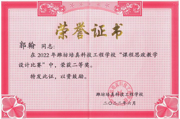 作为青年教师,郭翰积极努力、不断提高业务能力,获得了思政教学设计比赛二等奖、教学基本功大赛一等奖、立项了“疫情防控与教育教学”专项课题。